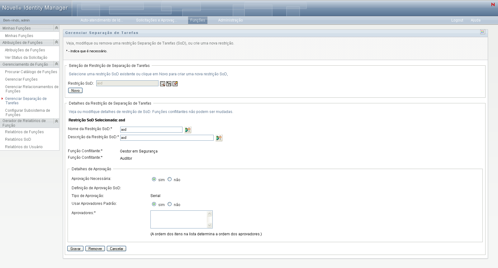 Para obter informações sobre como preencher os campos, consulte a Tabela 17-5, Detalhes da Restrição de Separação de Tarefas e a Tabela 17-6, Detalhes de Aprovação.