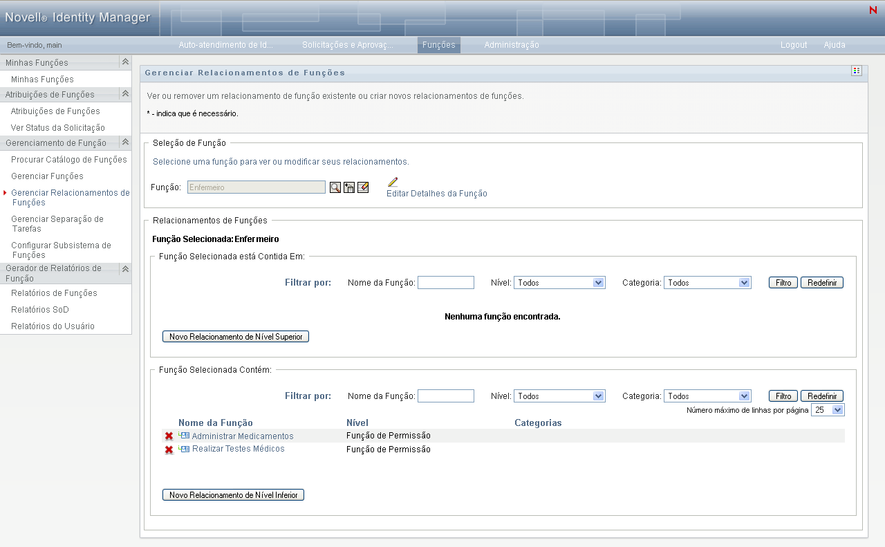 As funções de nível inferior (funções de permissão) podem ser contidas pelas funções de nível superior, mas não podem conter outras funções de nível inferior. A página Relacionamento de Função permite adicionar apenas uma Nova Função de Nível Superior.