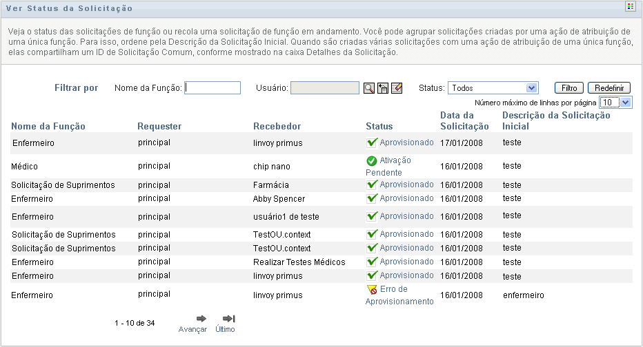 Grandes conjuntos de resultados Por padrão, a página Ver Status da Solicitação recupera até 10.000 objetos Solicitação. Se você tentar recuperar um maior conjunto de resultados, uma mensagem será exibida indicando que o limite foi atingido. Nesse caso, restrinja sua pesquisa (especificando um usuário ou um status específico, por exemplo) para limitar o número de objetos retornados no conjunto de resultados. Observe que, quando você aplica um filtro a um nome de função, ele limita sua exibição e a ordem, e não o número de objetos retornados.