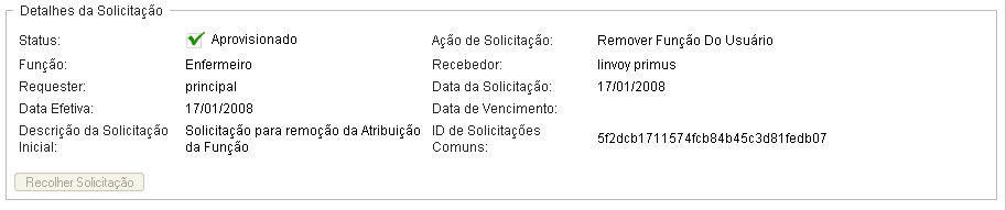 A ação permite ver o status de suas solicitações de função, incluindo as solicitações feitas diretamente e as solicitações de atribuição de função para grupos ou containers aos quais você pertence. Permite ver o estado atual de cada solicitação. Além disso, ela permite recolher uma solicitação ainda não concluída ou terminada caso você tenha mudado de idéia e não precise mais atender à solicitação.