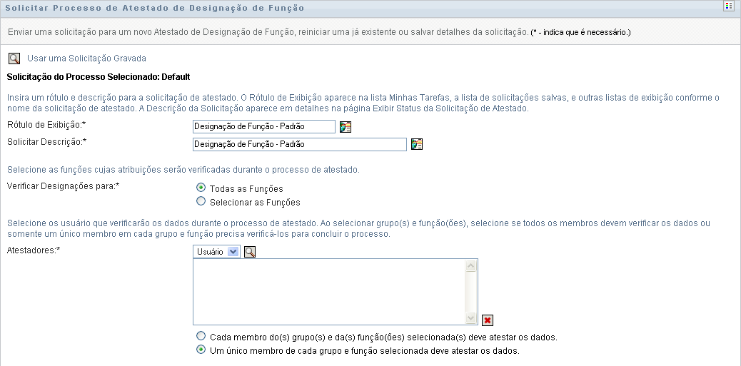 Você deve selecionar pelo menos um usuário, grupo ou função como atestador para iniciar um processo de atestado. Entretanto, não precisa selecionar um atestador para gravar uma solicitação.