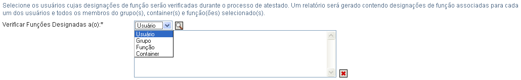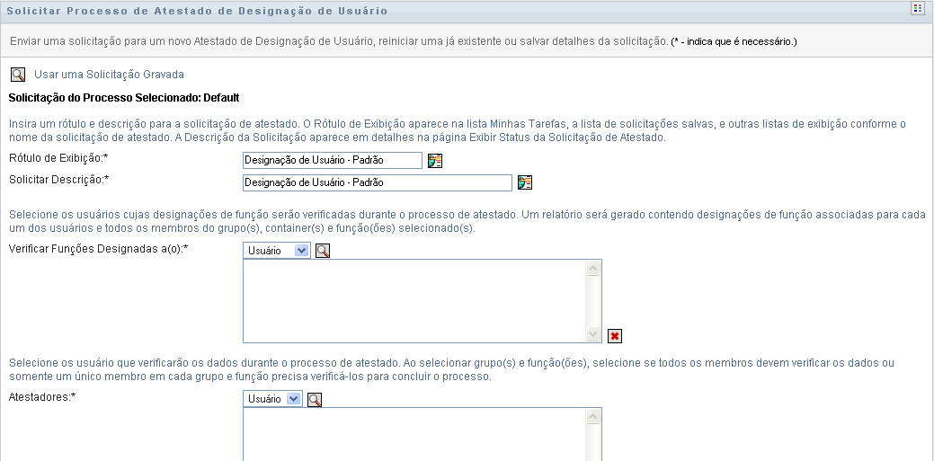 Você deve selecionar pelo menos um usuário, grupo, função ou container para iniciar um processo de atestado. Entretanto, não precisa selecionar um usuário, grupo, função ou container para gravar uma solicitação.