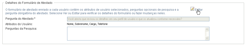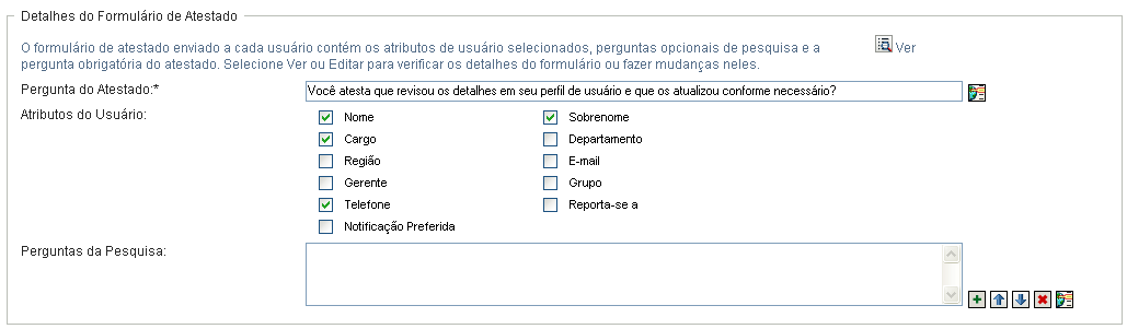 No campo , você pode opcionalmente incluir uma ou mais perguntas que o atestador pode responder durante a execução do processo de atestado. A inclusão de perguntas de pesquisa não é obrigatória em um processo de atestado. Entretanto, se forem incluídas, poderão ser respondidas opcionalmente pelo atestador.