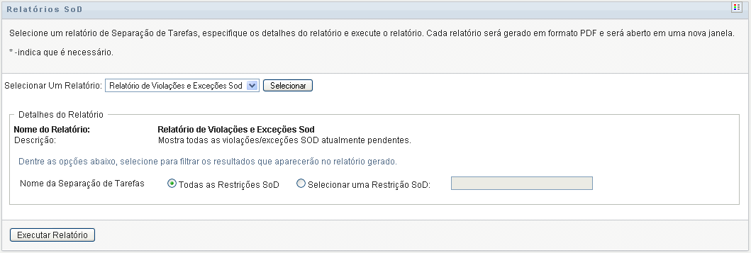 Para criar e ver o Relatório de Violações e Exceções SoD: