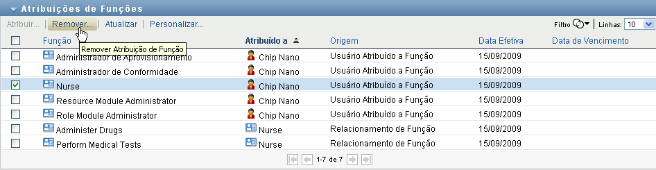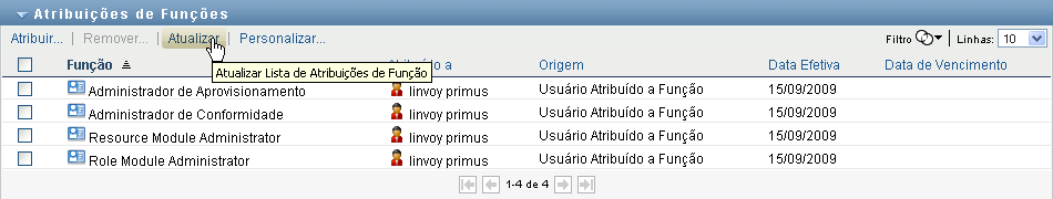 Quando não há nada selecionado no controle , a lista de atribuições de funções mostra as atribuições do usuário atual. Essas atribuições de funções incluem aquelas nas quais o usuário é recebedor ou destinatário, e as tarefas para as quais o recebedor ou destinatário é um grupo, container ou função ao qual o usuário atual pertence. O usuário pode realizar qualquer tarefa com suas atribuições de funções, desde que nenhum direito seja necessário para se trabalhar com suas próprias funções.