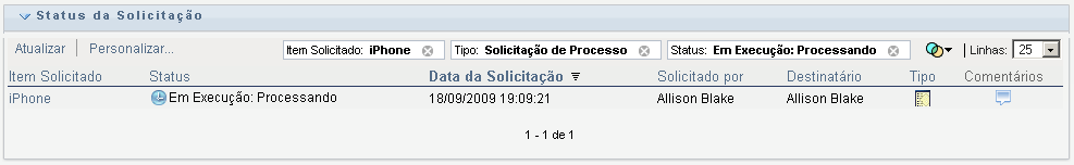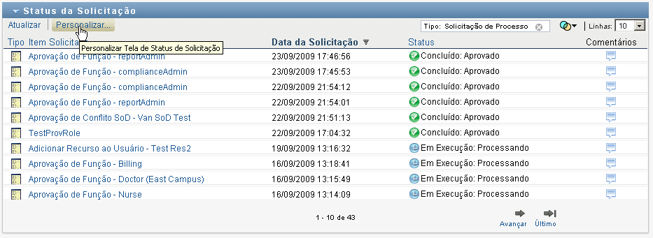 A lista inclui as solicitações ativas, assim como as solicitações que já foram aprovadas ou negadas. O administrador pode controlar por quanto tempo os resultados do workflow são mantidos. Por padrão, o sistema de workflow mantém os resultados do workflow por 120 dias.