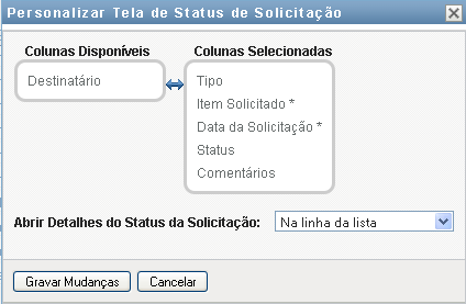O Aplicativo de Usuário exibe a caixa de diálogo , na qual você pode personalizar a tela da lista de solicitações. O conjunto de controles apresentado pode variar de acordo com as configurações disponibilizadas pelo administrador para o usuário substituir.