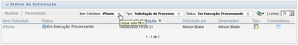 A lista de solicitações será atualizada para refletir o estado real da lista de solicitações do usuário atual. O botão não remove nenhum filtro que você tenha aplicado à lista de solicitações. Quando você atualiza a lista de solicitações, todos os filtros que você definiu são usados para atualizar a lista, e os filtros permanecem em vigor até serem redefinidos.