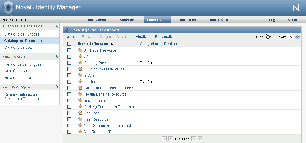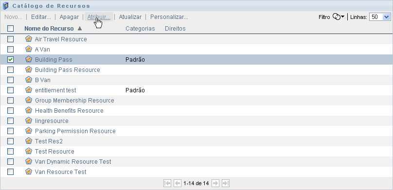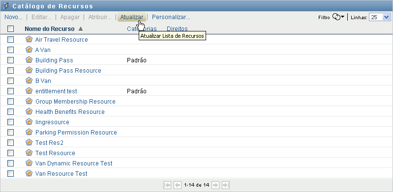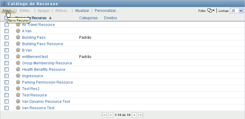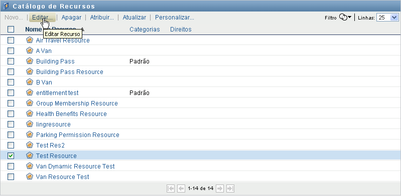A ação da guia da interface do usuário do Identity Manager permite ver os recursos já definidos no catálogo. Ela também permite criar novos recursos e modificar, apagar e atribuir recursos existentes.