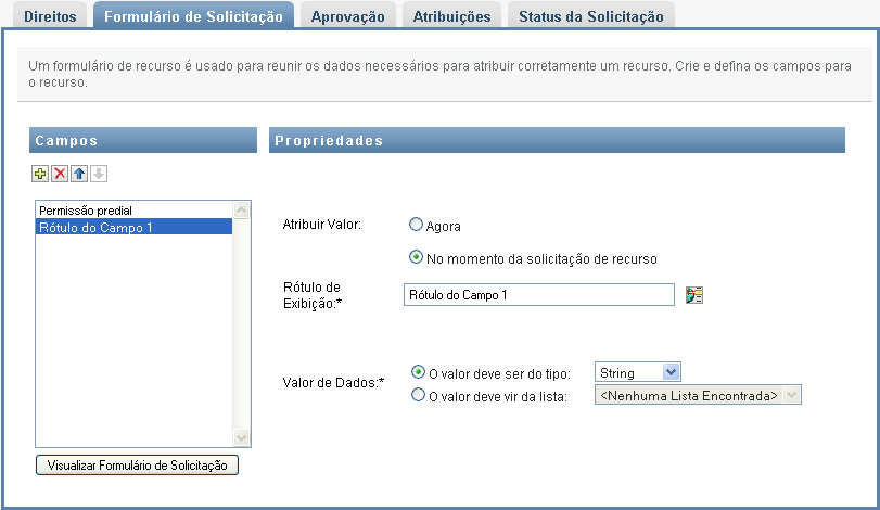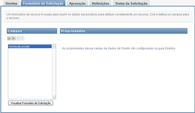 Para obter detalhes sobre como trabalhar com o formulário de solicitação, consulte Atribuindo um recurso do catálogo.