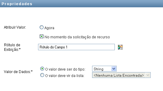 Insira um rótulo de exibição para o campo e especifique se o valor deve ser do tipo de dados particular ou se deve vir de uma lista.