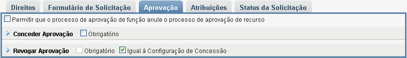 Se a caixa de seleção estiver marcada, o processo de aprovação de função sempre substituirá o processo de aprovação de recurso toda vez que o recurso estiver associado a uma função. Após a aprovação da função associada, o recurso será automaticamente aprovisionado, sem necessidade de aprovação nenhuma.