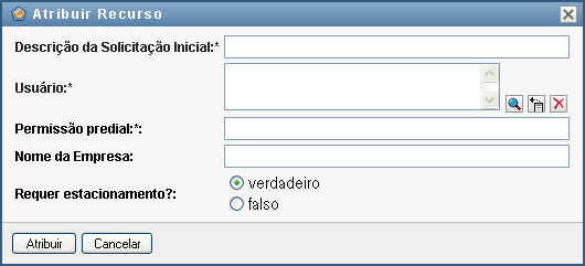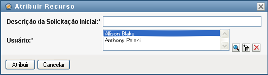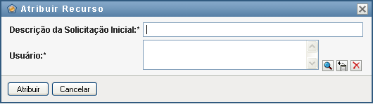 Os campos e são obrigatórios e aparecem em todos os formulários de solicitação de recurso. É possível usar o Seletor de Objetos para selecionar os usuários para a atribuição de recurso.