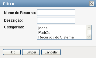 Na caixa de diálogo , especifique uma string de filtro para o nome ou a descrição do recurso ou selecione uma ou mais categorias para as quais deseja ver os recursos. Clique em :
