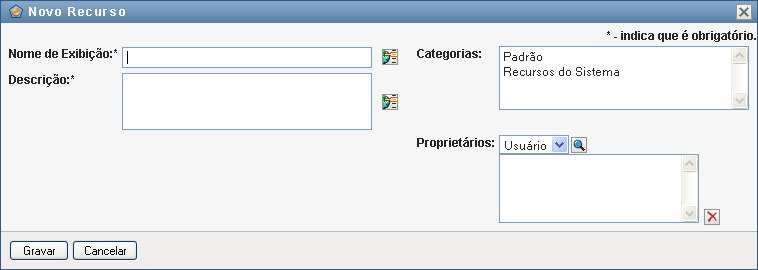 O texto usado quando o nome do recurso aparece no Aplicativo de Usuário. Não é possível incluir os seguintes caracteres no ao criar um recurso: < > , ; \ " + # = / | & * É possível traduzir esse nome para qualquer um dos idiomas suportados do Aplicativo do Usuário. Para obter mais informações, consulte a Tabela 1-1, Botões comuns. |