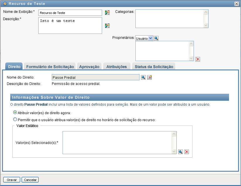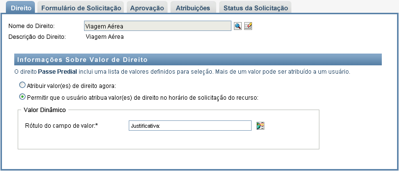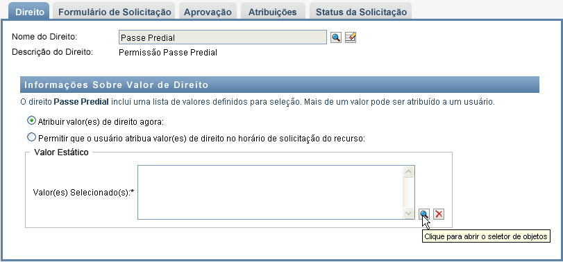 O direito que aceita um ou mais valores de parâmetro. Por exemplo, o recurso pode ser vinculado a um direito chamado Passe Predial, que permite ao requester selecionar um ou mais prédios. Os valores permitidos são fornecidos por uma lista de direitos, que pode incluir uma lista estática de valores definidos pelo administrador, ou uma lista dinâmica de valores gerados a partir de uma consulta LDAP. É possível atribuir um valor em tempo de design quando você está definindo o recurso, ou permitir que o usuário atribua um valor na hora da solicitação. Para obter mais informações, consulte Vinculando a um direito multivalor. |