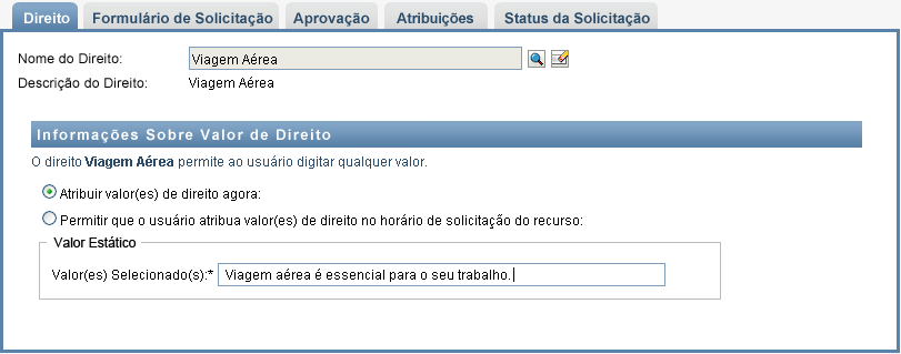 O direito não aceita nenhum valor de parâmetro. Por exemplo, o recurso pode ser vinculado a um direito chamado Benefícios à Saúde que simplesmente torna o recebedor elegível para os benefícios do serviço de saúde. Esse tipo de direito tem um comportamento fixo e, conseqüentemente, não requer mais informações do requester. Quando você vincula a um direito sem valor, não é necessária mais nenhuma informação. |