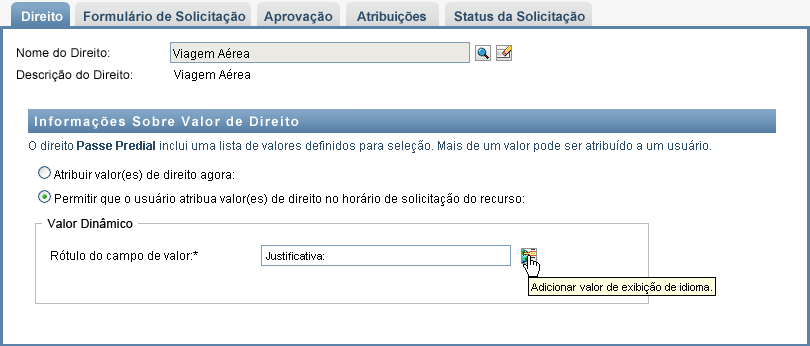O direito que exige um valor de parâmetro especificado como uma string de formato livre na hora da solicitação. Por exemplo, o recurso pode ser vinculado a um direito chamado Vestuário, que permite ao requester especificar um valor que represente sua cor favorita. É possível atribuir um valor em tempo de design quando você está definindo o recurso, ou permitir que o usuário atribua um valor na hora da solicitação. Para obter mais informações, consulte Vinculando a um direito com valor de formato livre. |