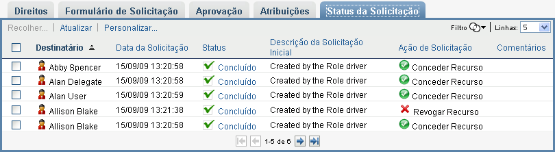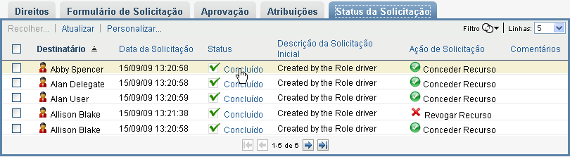 A ação mostra todas as solicitações de atribuição de recurso, incluindo as que estão em execução, com aprovação pendente, aprovadas, concluídas, recusadas ou terminadas.