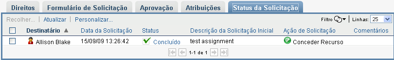 A ação permite ver o status das suas solicitações de atribuição de recurso, incluindo as que você fez diretamente e os recursos atribuídos por meio das funções. Permite ver o estado atual de cada solicitação. Além disso, ela permite recolher uma solicitação ainda não concluída ou terminada caso você tenha mudado de idéia e não precise mais atender à solicitação.