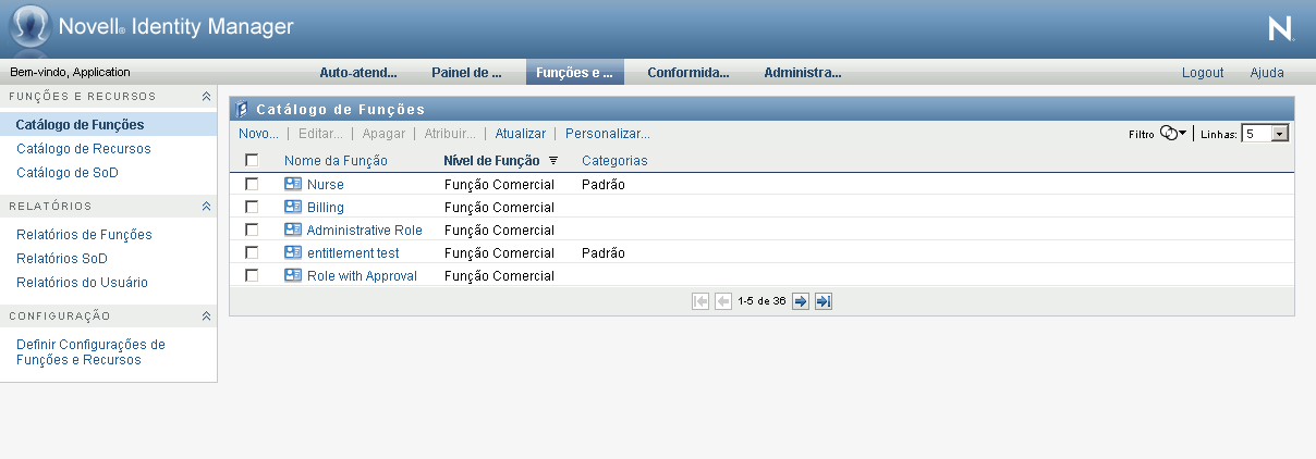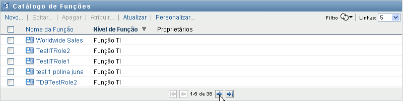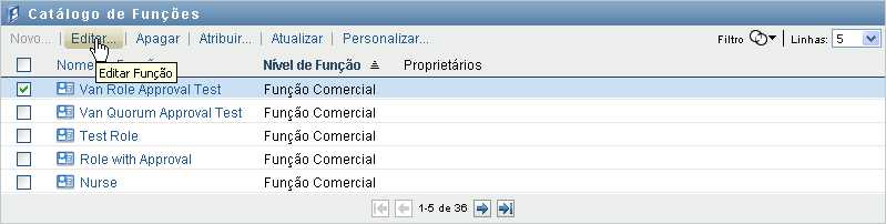 A ação da guia na interface do usuário do Identity Manager permite ver as funções que já foram definidas no catálogo. Ela também permite criar novas funções e modificar, apagar e atribuir funções existentes.