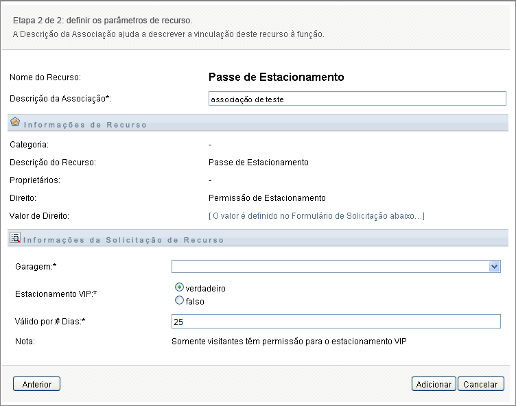 No campo , digite o texto explicando o motivo pelo qual o recurso foi associado à função.