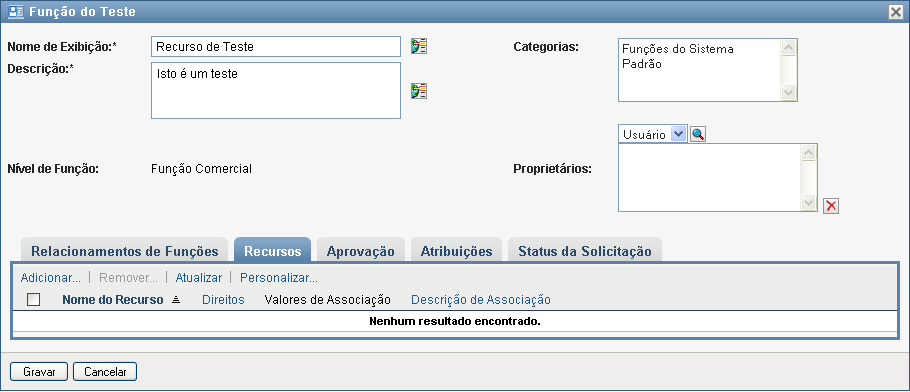 Direitos associados a funções existentes: As funções definidas em versões anteriores do Módulo de Aprovisionamento Baseado em Funções podem ter direitos associados. Se uma função tiver um direito associado a ela, a interface do usuário exibirá a guia , em que você verá o mapeamento de direitos e poderá removê-lo. Os mapeamentos de direitos foram descontinuados nesta versão. Eles ainda funcionarão nesta versão, mas a Novell recomenda associar os direitos a recursos, em vez de funções.