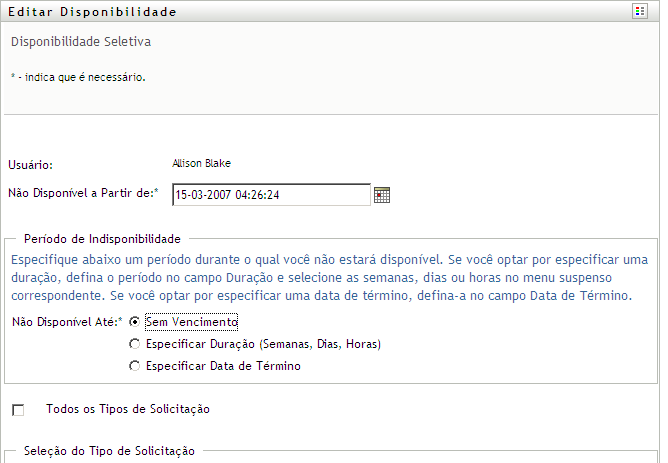O Aplicativo de Usuário exibe um conjunto de controles que permite especificar o período em que você estará indisponível e escolher as solicitações às quais essa configuração se aplica.