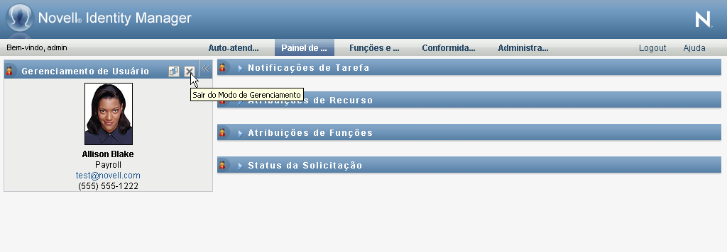 Para sair do modo de gerenciamento e redefinir o Painel de Trabalho para mostrar os dados e as permissões de acesso do usuário conectado no momento: