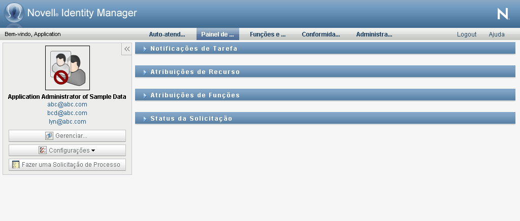 Depois que você efetuar login, o Aplicativo do Usuário do Identity Manager exibirá as páginas de guia em que você trabalhará: