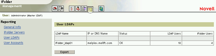 Acesse o Console de gerenciamento do iFolder e clique em Reporting (Geração de relatórios).