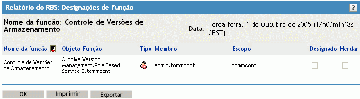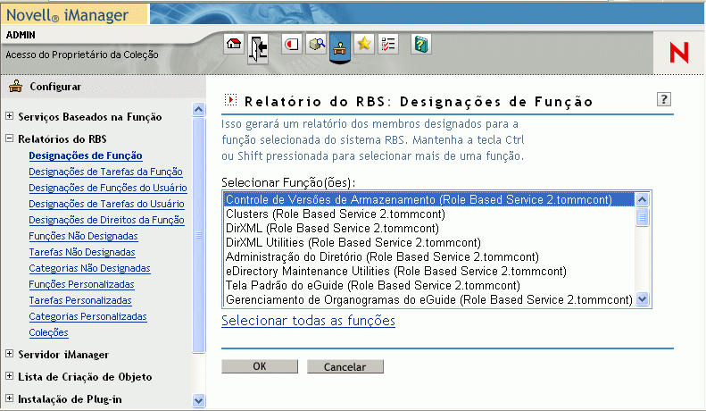 Cada relatório requer algumas informações iniciais, como as funções para as quais será gerada uma lista de membros designados. Após você fornecer as informações e clicar em OK, o iManager gerará o relatório.
