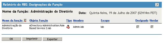 As tarefas de Relatórios do RBS geram relatórios que você pode classificar, imprimir e exportar. A próxima figura mostra um exemplo de relatório do iManager.