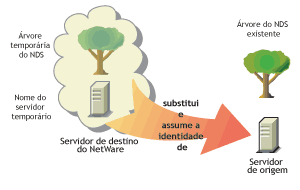 Após a migração do sistema de arquivos e do banco de dados do NDS do servidor de origem para o servidor de destino, o servidor de origem é automaticamente desativado e o servidor de destino é reinicializado, assumindo o nome e a identidade do servidor de origem na rede existente.