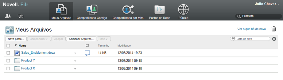 No Filr, você acessa esses arquivos corporativos clicando em Pastas de Rede no cabeçalho. Ou, no caso de arquivos no diretório pessoal, o acesso é feito clicando em Meus Arquivos.