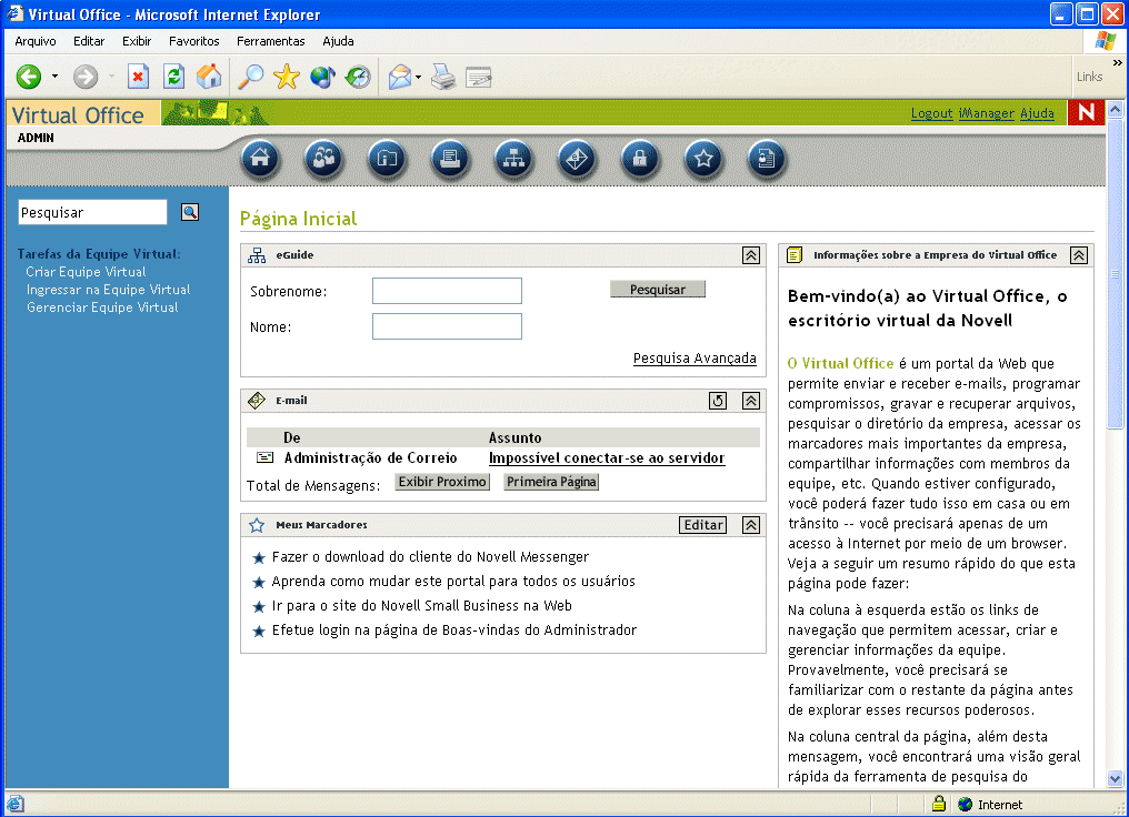 Se você tiver instalado o padrão Servidor de colaboração com Virtual Office do Novell Small Business, a página do Virtual Office se tornará o portal padrão do usuário final. Com os links fornecidos, você pode personalizar o site de acordo com as necessidades de sua empresa. Para obter mais informações sobre como configurar o Virtual Office, consulte os links fornecidos nesta página e o Guia de Configuração do Novell Virtual Office.