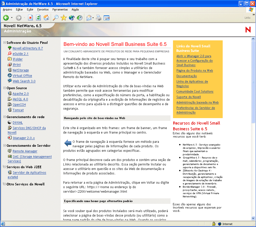 O Novell® GroupWise®, o BorderManager® e o ZENworks® não estão totalmente integrados ao site de boas-vindas na Web.