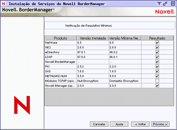 Se algum dos requisitos mínimos, com exceção dos módulos TCPIP ou do iManager 2.0, não for atendido, a instalação será interrompida. Atenda aos requisitos de acordo com as informações da figura acima e reinicie a instalação. Se os requisitos básicos para os módulos TCPIP não forem atendidos, será exibido um aviso. Você pode ignorar esse aviso e prosseguir com a instalação; entretanto, será preciso copiar os módulos TCPIP corretos posteriormente (consulte Pré-requisitos de instalação do Novell BorderManager 3.8) se quiser utilizar os serviços VPN.