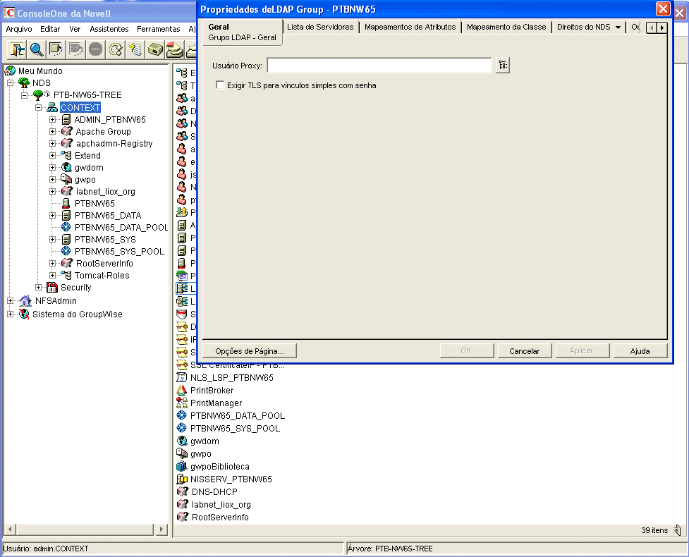 Para habilitar as Senhas não criptografadas, efetue login no ConsoleOne, clique duas vezes no contexto do servidor no qual você está instalando o Novell BorderManager 3.8, selecione Objeto grupo do LDAP > clique o botão direito do mouse em Propriedades. Marque a caixa Permitir senha não criptografada (para o eDirectory 8.6.2) ou desmarque Necessário TLS para vinculação simples com senha (para o eDirectory 8.7.1).