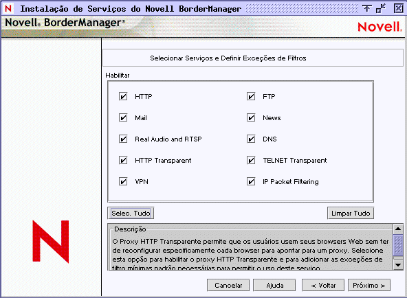 A página seguinte mostra os serviços do Novell BorderManager 3.8 que serão instalados. Eles são: