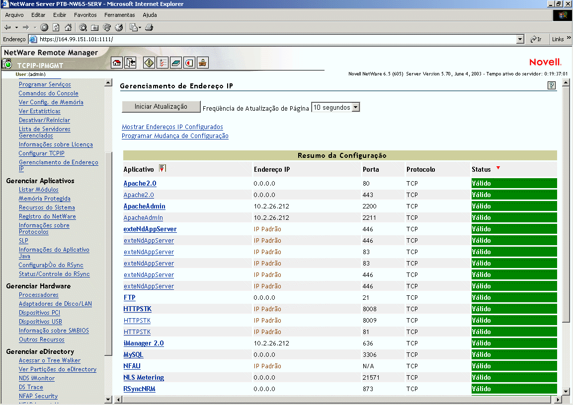 A página Gerenciamento de endereço IP relaciona os aplicativos atualmente configurados na estrutura e ajuda a resolver conflitos de endereços IP e portas dos aplicativos executados no NetWare 6.5.