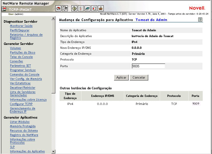 Para mudar a configuração de um aplicativo, clique em qualquer entrada abaixo de Aplicativo na página Gerenciamento de endereço IP. A página Mudança de configuração para aplicativo nome_do_aplicativo é exibida.
