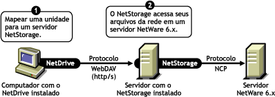 Nesse cenário, o NetDrive permite que você use protocolos facilmente reconhecidos pela Internet (WebDAV sobre HTTP) para mapear uma unidade para um servidor NetWare por meio do NetStorage. O NetStorage acessa o servidor NetWare por meio do NCPTM (Novell Core Protocol), lê seu script de login e, em seguida, exibe todas as suas unidades mapeadas e arquivos a partir de uma localização central.