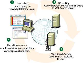 In Figure 5, the user enters a search query in a search form found on www.digitalairlines.com (1 and 2). When the user clicks the Search button, the query is sent to search.digitalairlines.com, which is hosted by the NetWare Web Search Server (3), which then processes the query using index files that were created using the Web Search Manager.