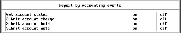 Report by server events. This filter shows the server audit events defined for the current menu. Because of the screen size, only 16 events are shown at one time, with the remainder of the events available using the Page Up and Page Down and arrow keys.