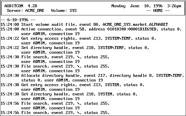 If you select a filter and press Enter, the audit file is displayed. The second line of the header area shows your location in the audit file or when AUDITCON is waiting for information from the server. - HOME - indicates the beginning of the file and - END - indicates the end of the audit file.