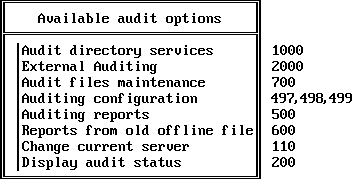 When you run AUDITCON, it displays a screen with an Available audit options menu as shown in Figure 7. There are five such top-level menus. The one AUDITCON displays depends on four variables: