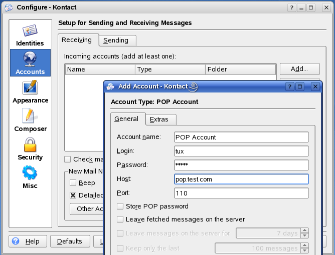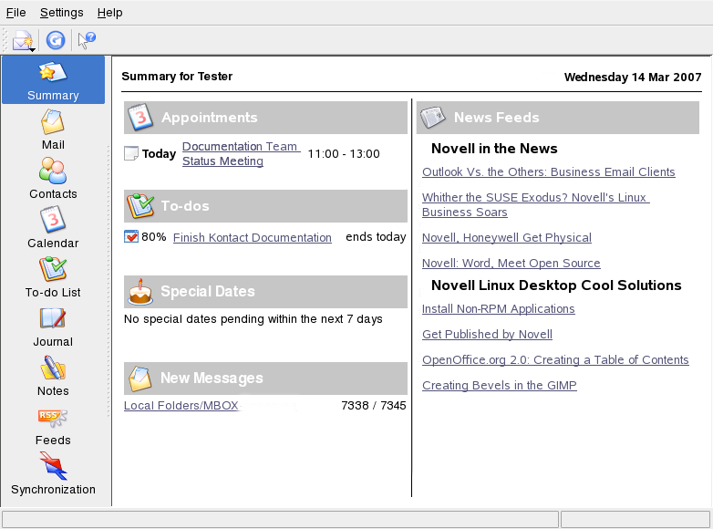 Para ler e gerenciar e-mails e compromissos no SUSE Linux Enterprise, você pode usar o Kontact como ferramenta PIM (personal information management - gerenciamento de informações pessoal). O Kontact combina aplicativos do KDE, como KMail, KOrganizer e KAddressBook, em uma única interface. Dessa forma, você tem acesso fácil a e-mail, calendário, bloco de endereços e outras funções PIM.