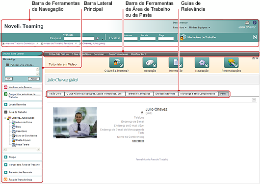 Ao iniciar o Novell Teaming pela primeira vez, você vê sua área de trabalho pessoal, que inclui as barras de ferramentas e os recursos a seguir: