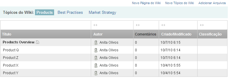 É possível organizar os Tópicos do Wiki para exibir páginas por , , ou .